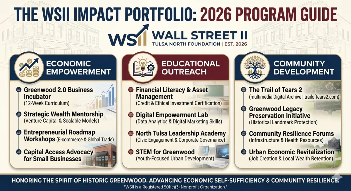 At the Wall Street II Tulsa North Foundation, Inc. (WSII), we believe that economic resilience is the cornerstone of a thriving community. Our foundation is deeply rooted in the history and spirit of Tulsa’s historic Greenwood District originally known as "Black Wall Street." We are dedicated to modernizing that legacy of self-sufficiency by advancing economic empowerment, education, and community development for the next generation.